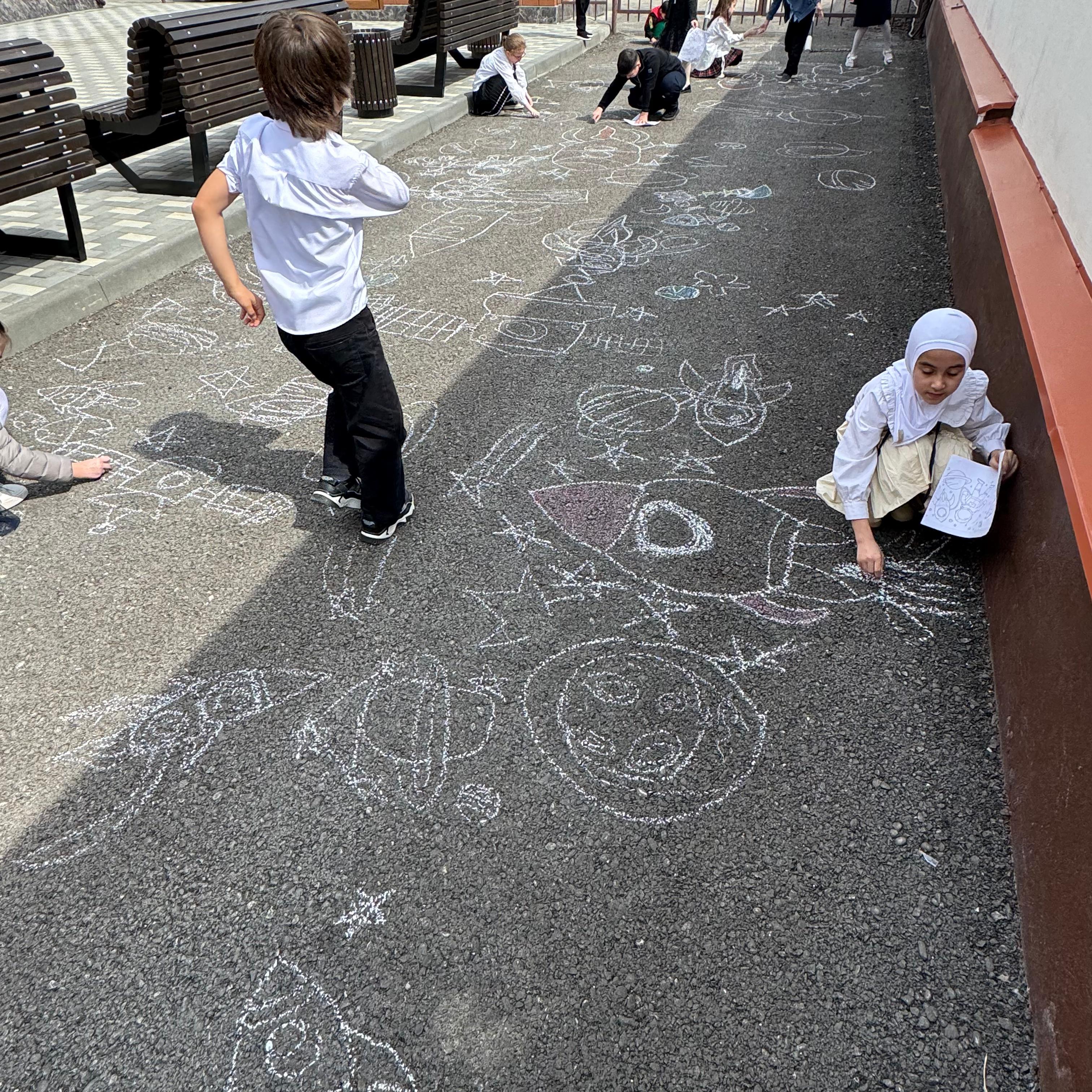 Ребята с большим увлечением играли цветными мелками, и вскоре асфальт на территории гимназии покрылся яркими рисунками. В них дети изображали ракету, небо со звездами, нарисовали космонавта. Детское творчество в технике коллективного рисунка мелом на асфальте позволяет не только проявить творческие способности, но зарядиться хорошим настроением и радостью от собственных «шедевров». С днем космонавтики!